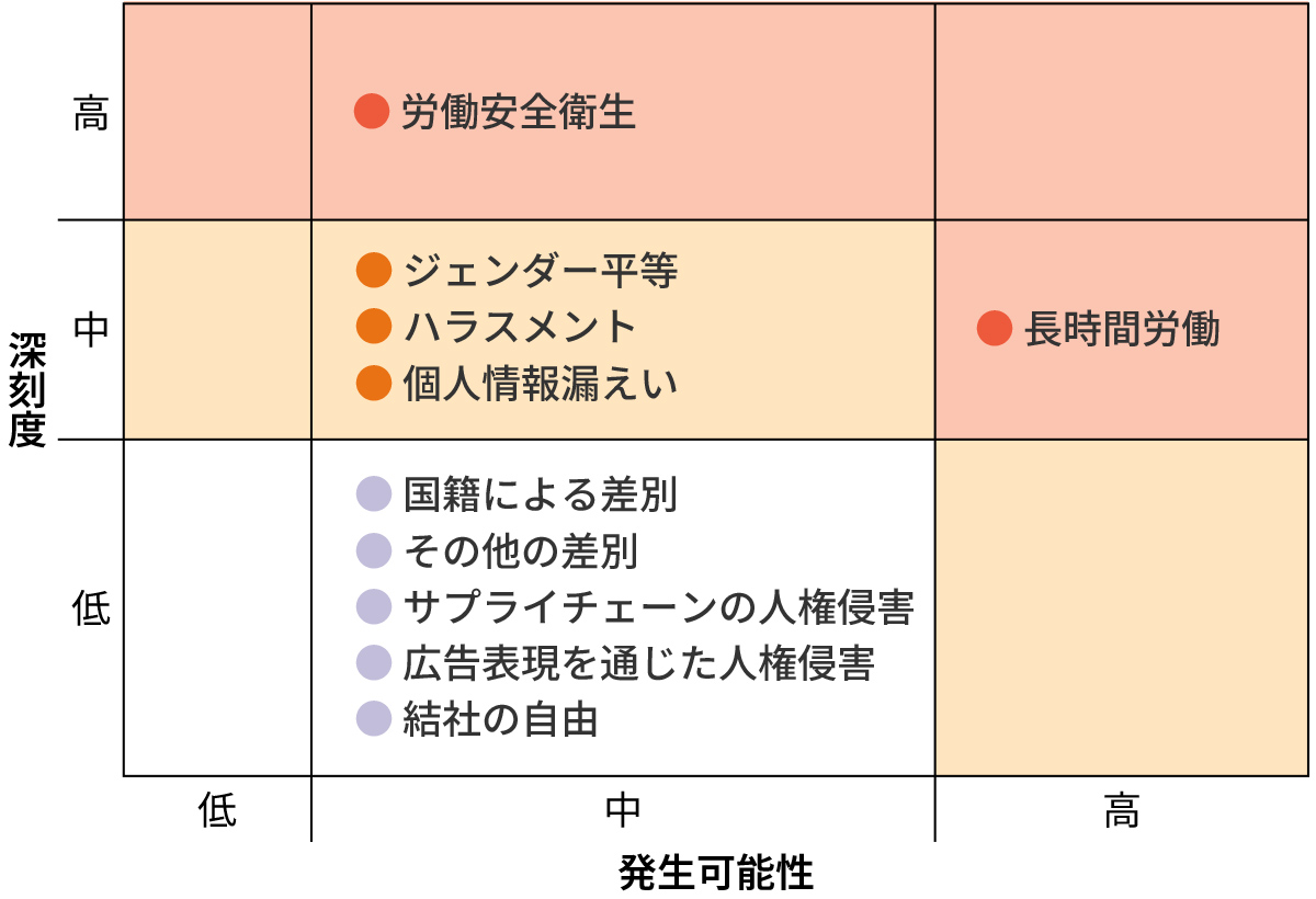国際的な人権規範を支持しサプライチェーン上に存在する人権リスクの低減を図っていくため、2025年4月「三愛オブリグループ 人権方針」を制定しました。制定にあたっては人権専門家による取引先を含めた人権リスク評価が行われ、その結果、当社グループの「主な人権リスク」は以下のとおりとなりました。リスクに対する対応部門を定め、人権推進の取り組みを進めていきます。