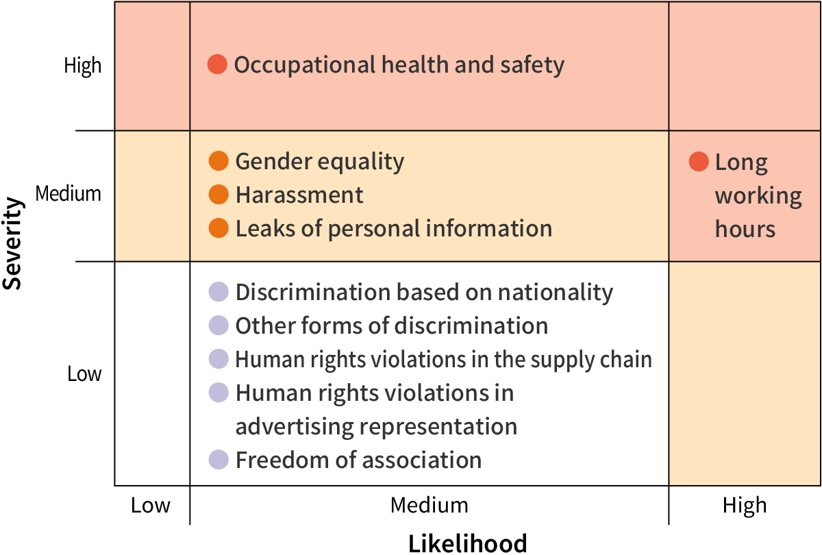 In April 2025, we established the SAN-AI OBBLI Group Human Rights Policy to support international norms on human rights and reduce human rights risks in our supply chain. To establish the policy, experts in the field conducted a human rights risk assessment that also looked at our business partners. The assessment determined that the Group faces the main human rights risks listed below. The Group assigns departments to respond to risks and will conduct initiatives to promote human rights.